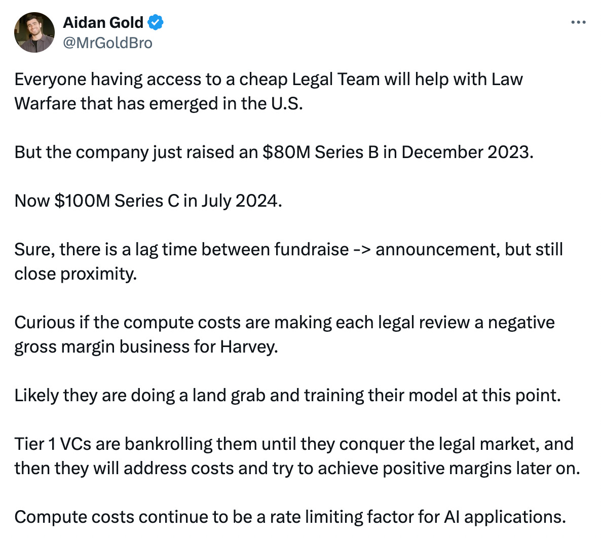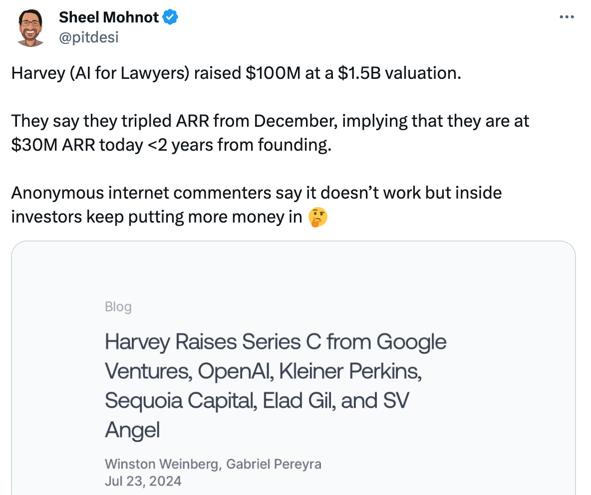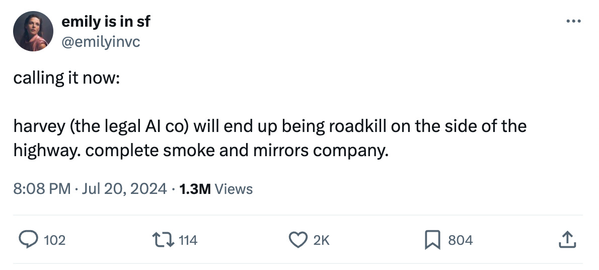 Yet, quite a few people ran with the first statement - and surprisingly, many agreed. The real question is: How long can Harvey keep riding this gravy train if the product is simply not good enough? The error rate in the LLMs powering these products (GPT-4 as far as I know) might simply be too high for the lawyers to accept the results.