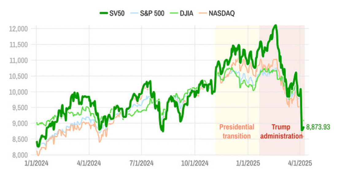 According to Nate Silver’s Silver Bulletin newsletter, 37 of the 50 companies in the SV50 (the 50 largest companies in Silicon Valley) have declined more than the Dow Jones Industrial Average since Inauguration Day, and two-thirds have fallen more than the S&P 500.